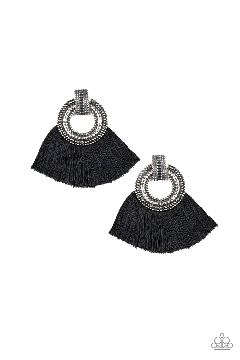 A plume of shiny black thread flares out from the bottom of an ornate silver fitting, creating a fierce fringe. Earring attaches to a standard post fitting.