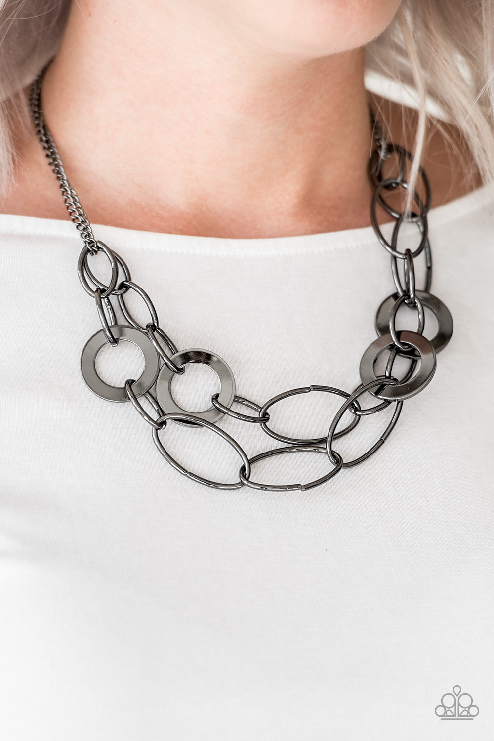 Mismatched gunmetal rings and hoops link below the collar in bold layers for a spunky industrial look. Features an adjustable clasp closure.