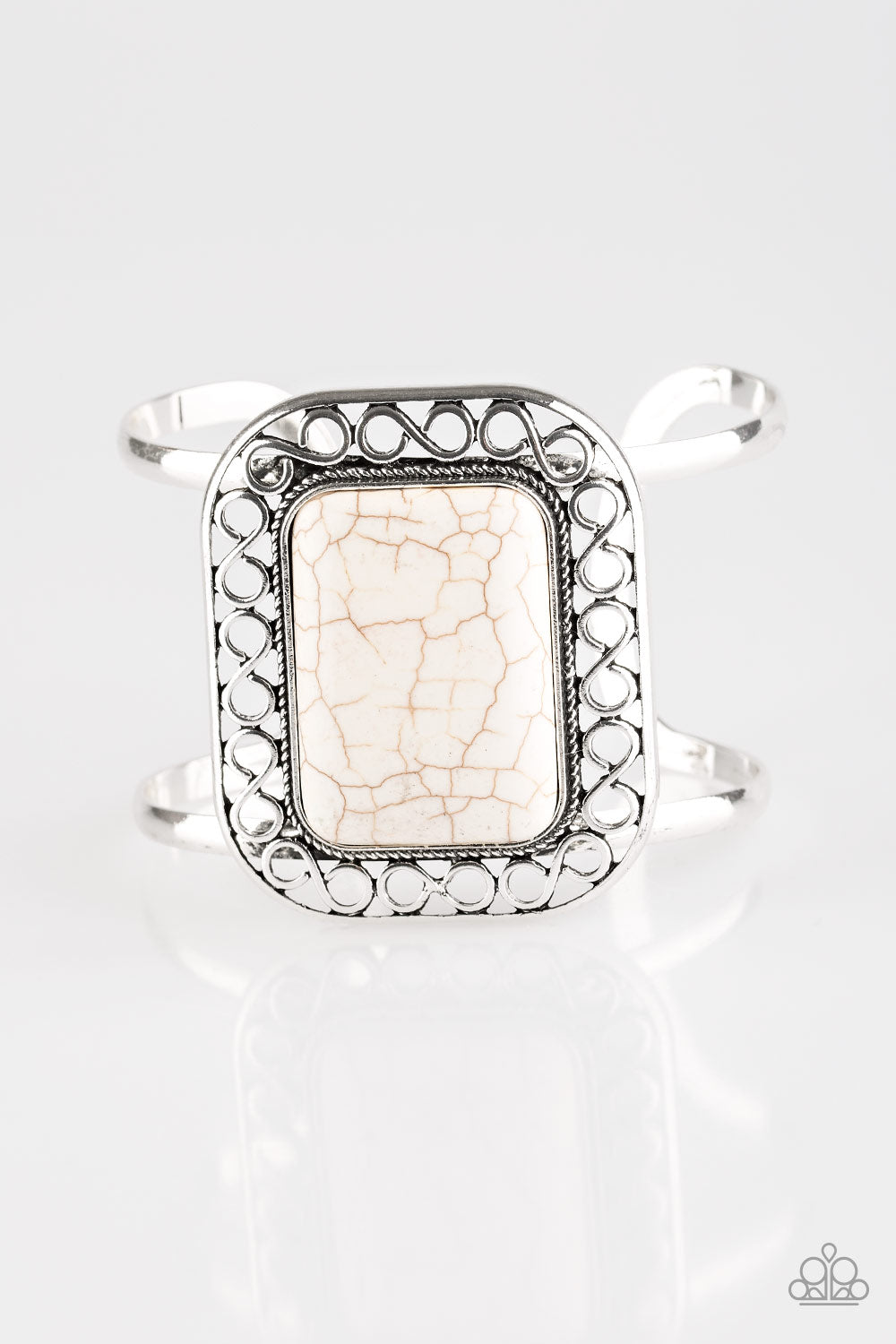Chiseled into a tranquil rectangle, a refreshing white stone is pressed into a shimmery silver frame swirling with texture for an artisan-inspired look. The earthy frame sits atop an airy silver cuff, creating a seasonal centerpiece.